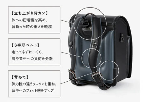 改良を重ねている。以前は機能面が弱いと言われることもあったが、2021年入学用モデルから「立ち上がり背カン」(肩ベルトが背中に沿って立ち上がる機能)と「S字形肩ベルト」を採用し、体へのフィット感と重さの分散を改善。