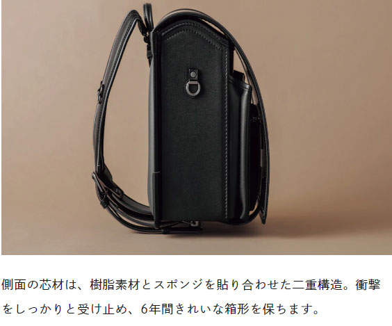 特にランドセルは横側の芯材に樹脂系の素材とスポンジを重ね合わせた二重構造を採用することで衝撃をしっかりと吸収し、いつもきれいな形を維持しています。